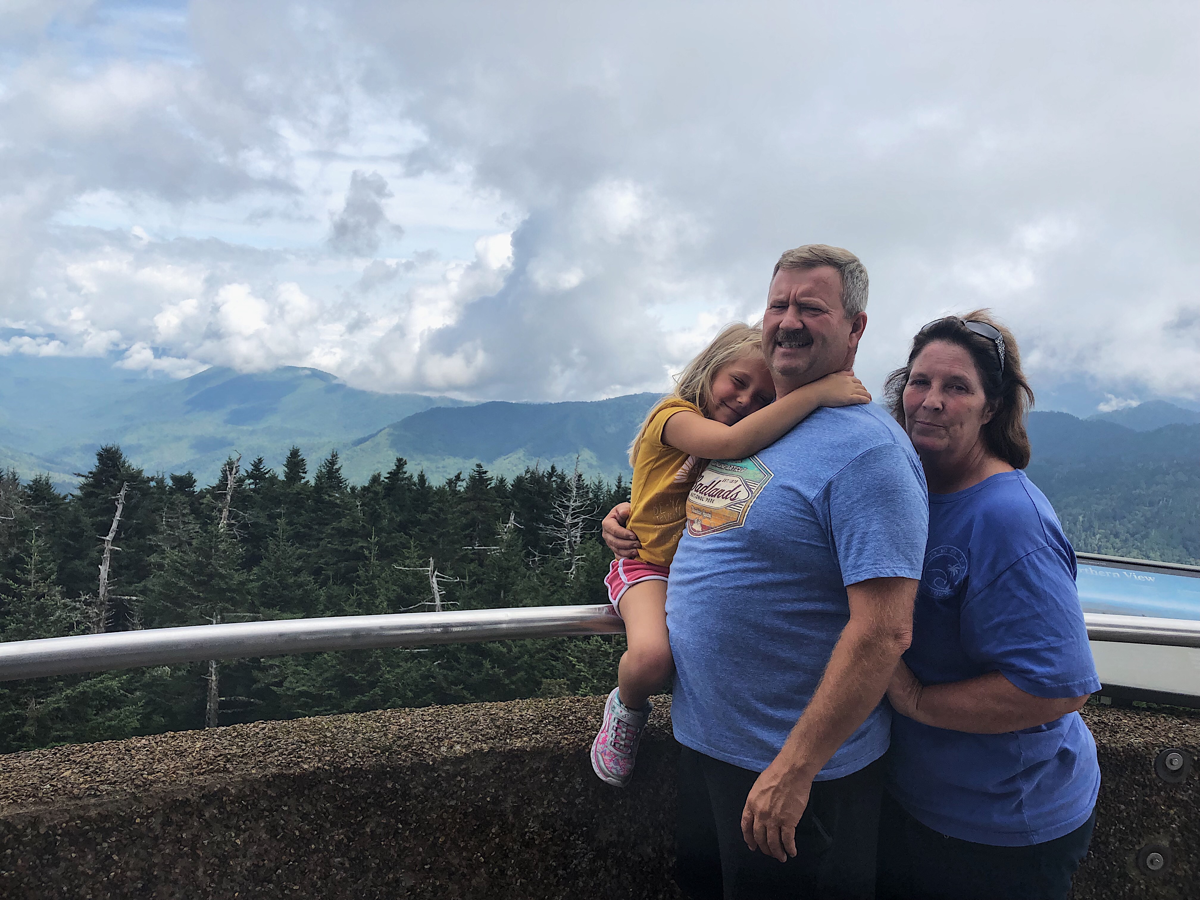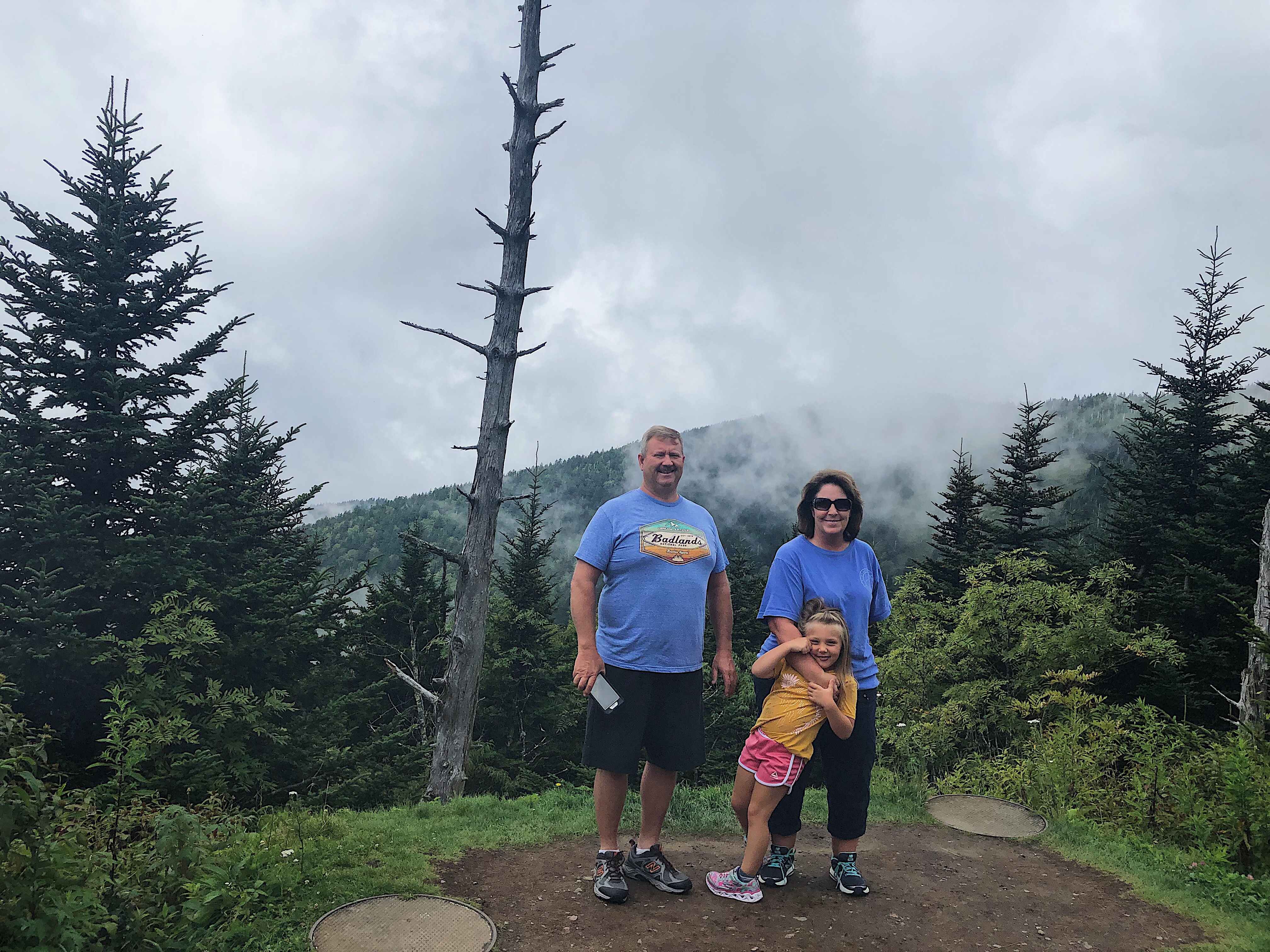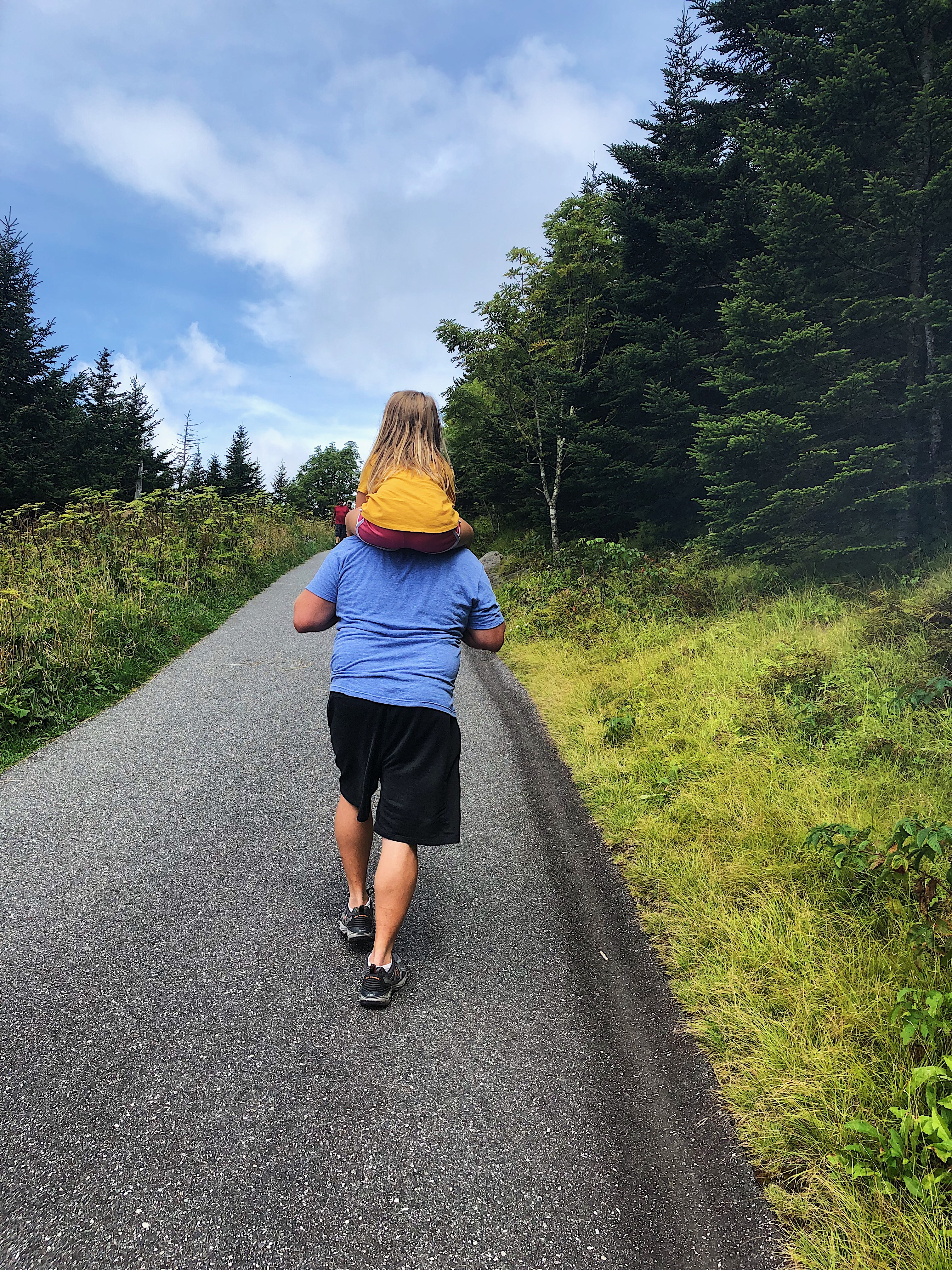 Our first stop was Clingman’s Dome, which is the highest mountain in the park! And the highest point in Tennessee. And the highest point along the Appalachian Trail. The trail is about 0.55 miles to the top of the observation tower. When we arrived, it was cloudy, chilly and heavily trafficked! Allegedly, it’s a 331 elevation gain, but in about a half a mile, it felt like more lol. Harper likes to hike, but she isn’t crazy about the uphill stuff. Somehow, my 50+ year old father managed to carry her on his shoulders up this steep pavement. People were applauding him, and saying “world’s greatest dad.” Meanwhile, My Mom and I took plenty of breaks lol. We were slower than my Dad with a 50 pound pound child on his back haha.