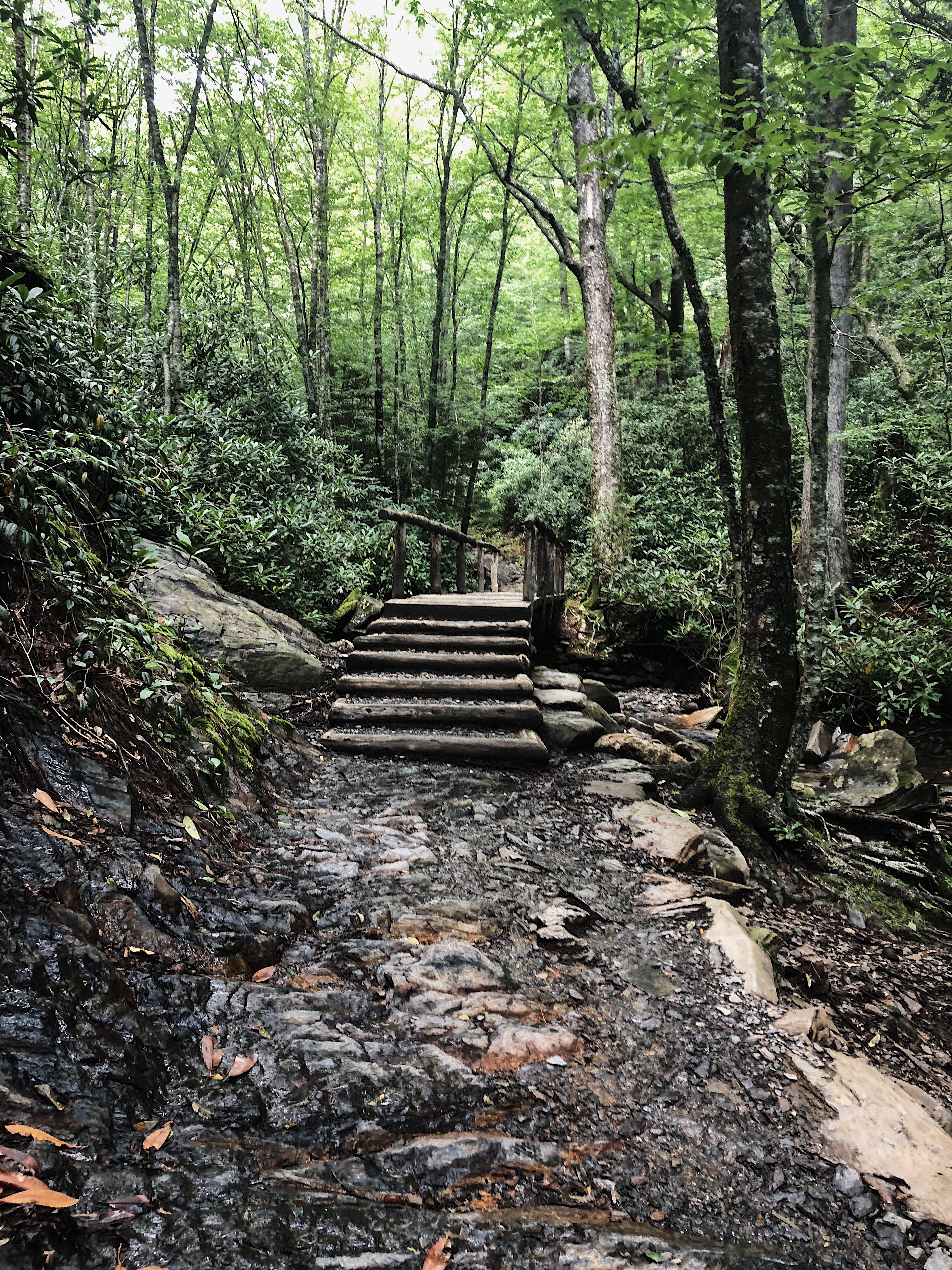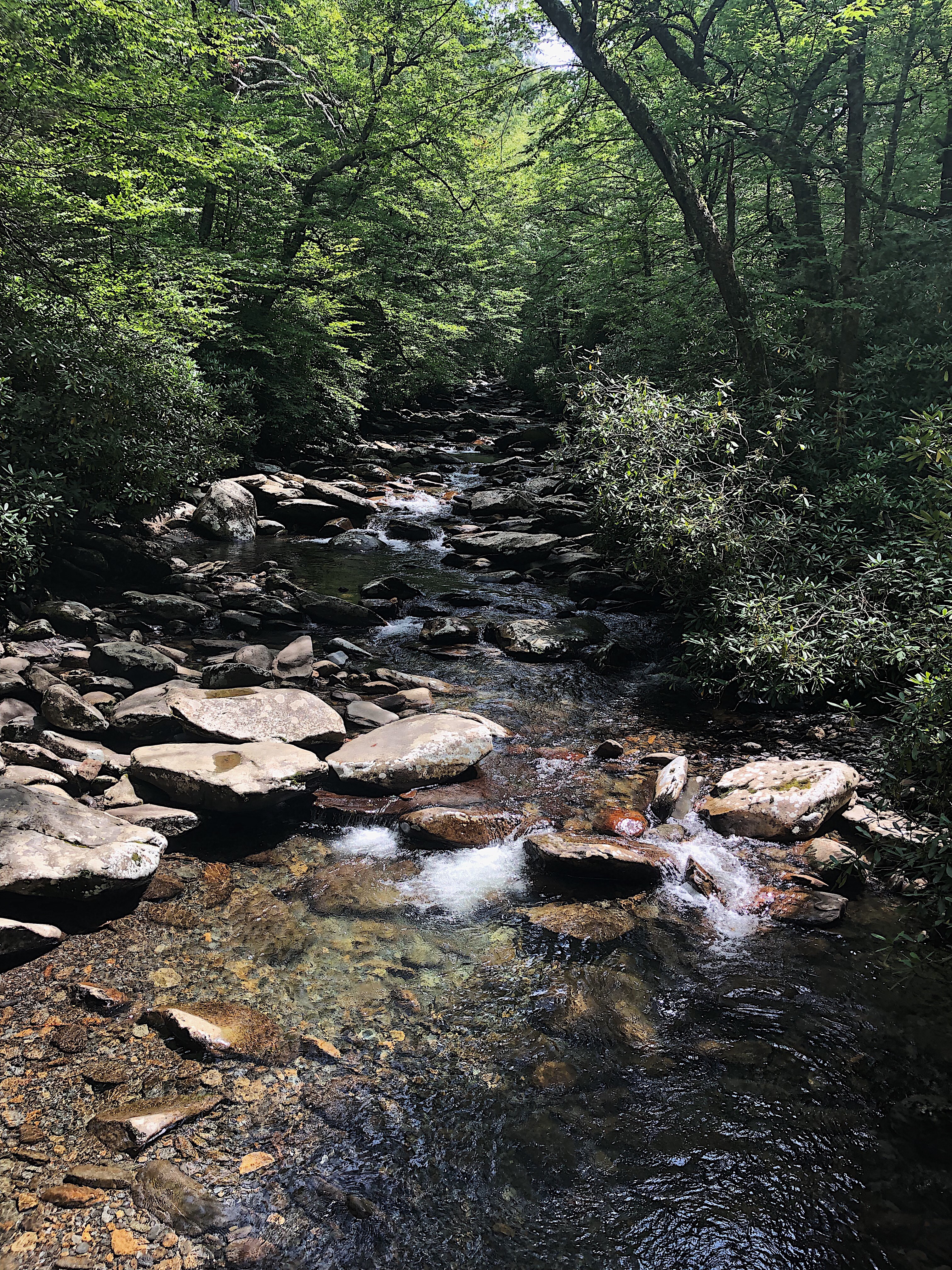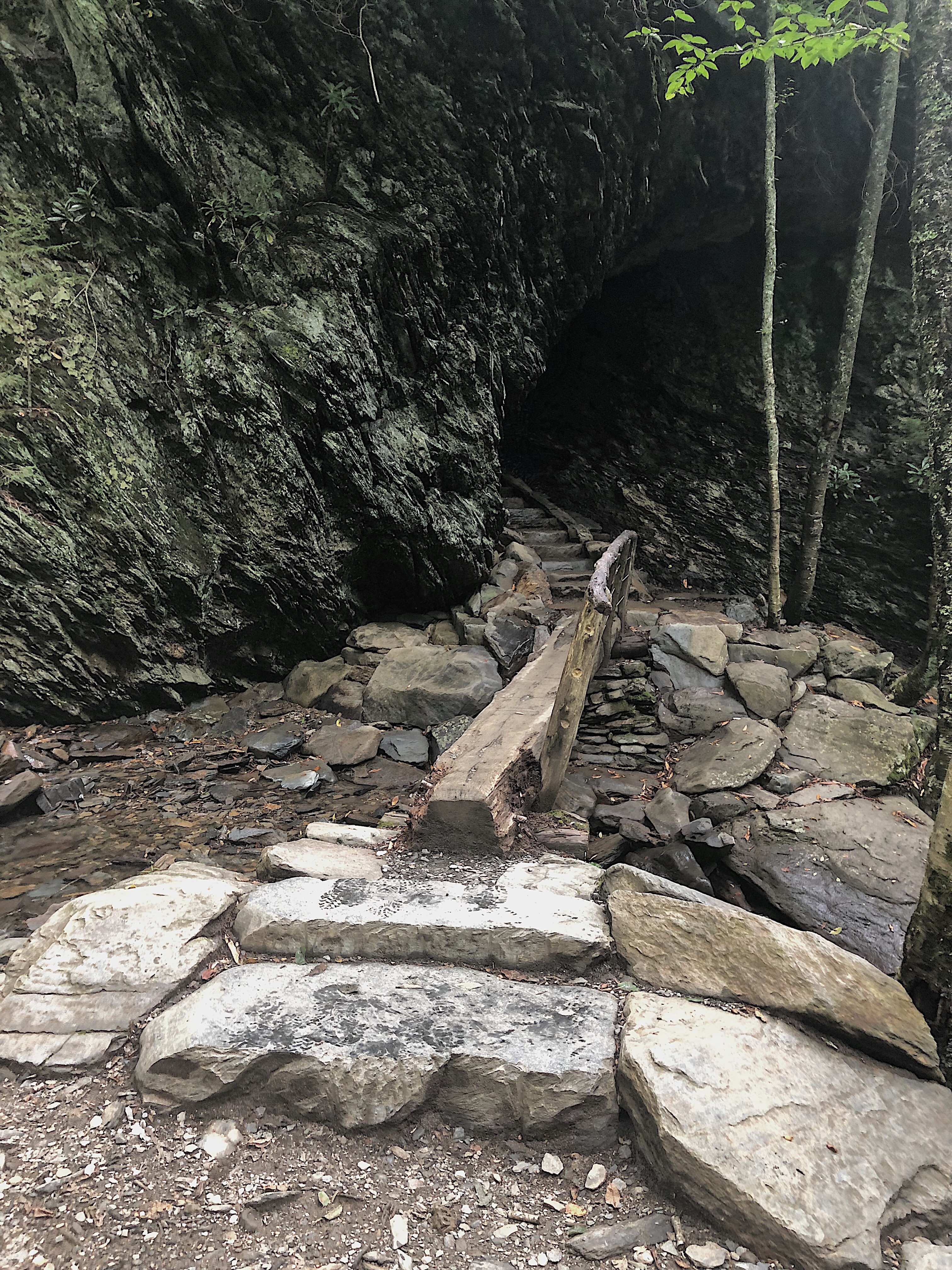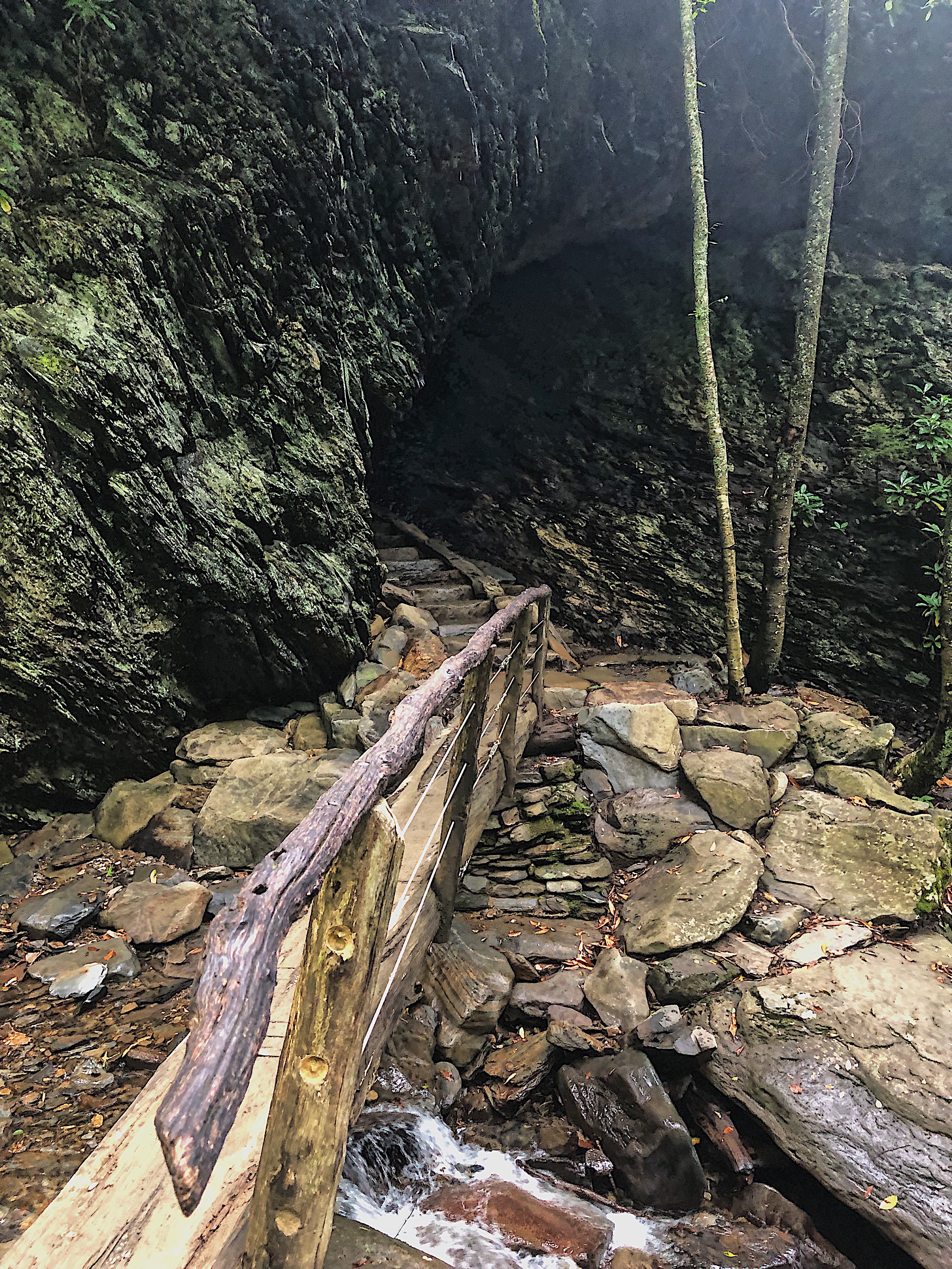 Alum Cave Trail is located in Tennessee, while the lookout points we visited were in North Carolina. This trail is a few miles down the road from Newfound Gap and marked clearly with a sign and parking. It’s a down and out type trail, so you can choose what you want to see/how far you want to go. The trail follows the Alum Cave Creek, which was beautiful and Harper ended up getting in twice! (more to that story, shortly.. lol). There was so much green surrounding us! On the way up to the Arch Rock, the incline was not terrible, definitely doable for the average out-of-shape person (myself lol).
