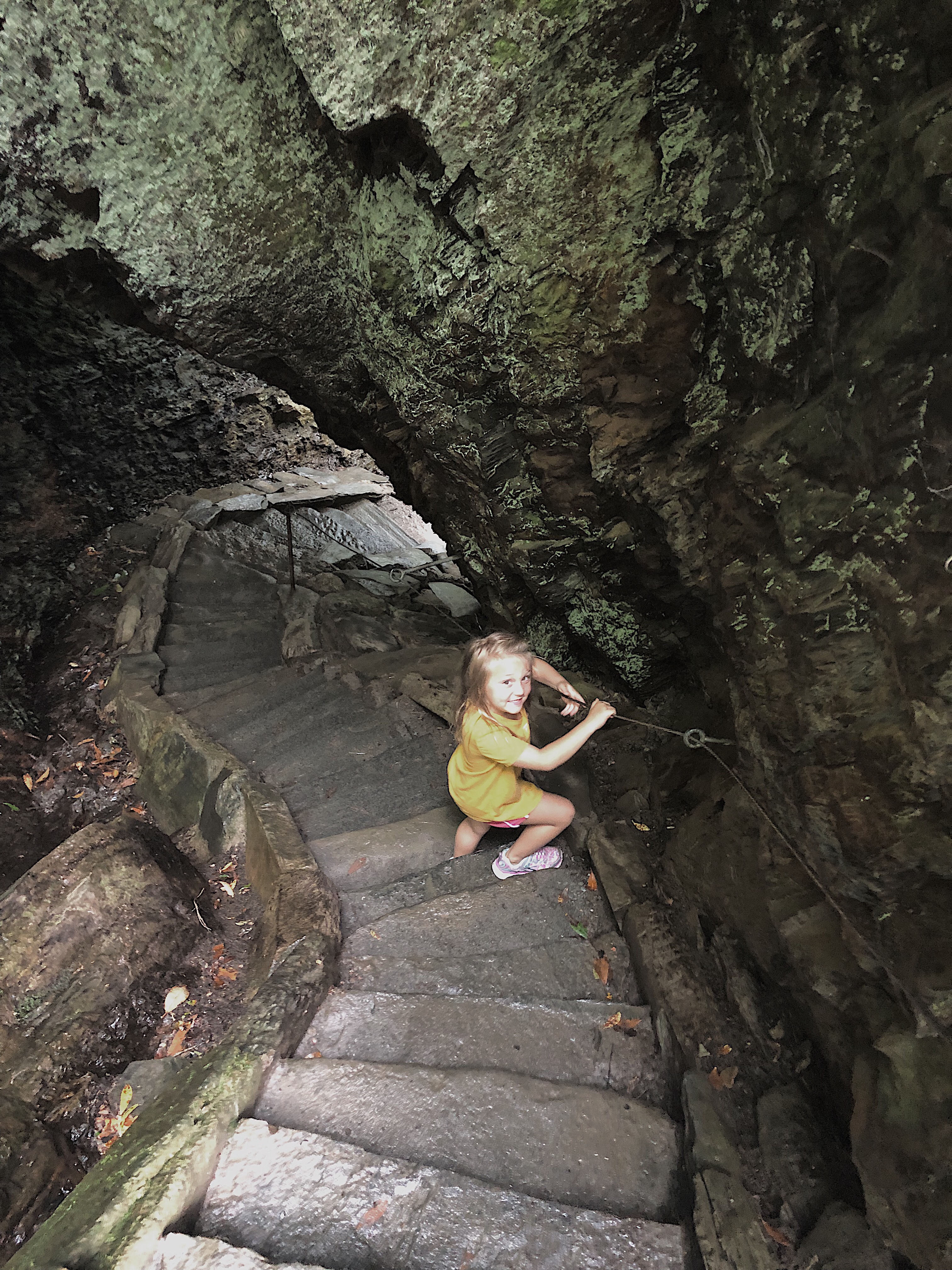 After catching our breath, we headed back down, which was much easier than going up. Harper managed the way down on her own, conveniently lol. After coming down, Harper had to go to the bathroom. So, we opened the door and she came into the bathroom after me, and almostly instantly covered her mouth and nose and said “ewwww.” She experienced her first “hole in the ground” toilet, but would not use it lol. She was spitting and gagging after going in there; mom and I were laughing so hard.